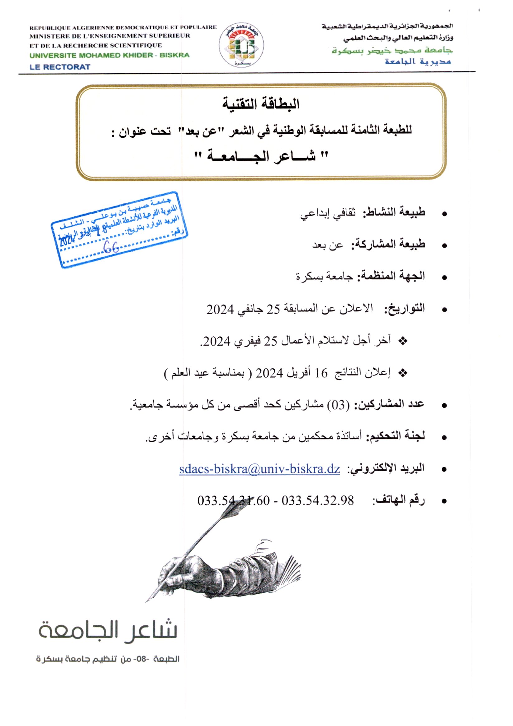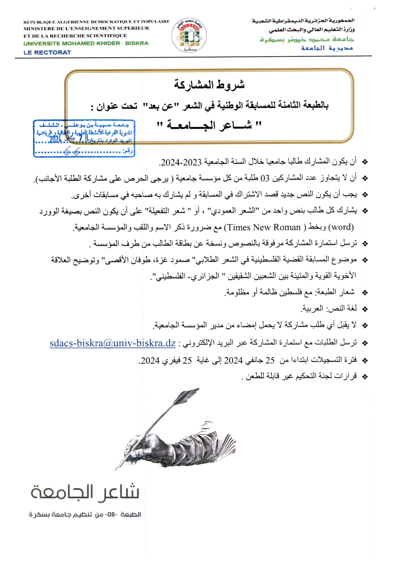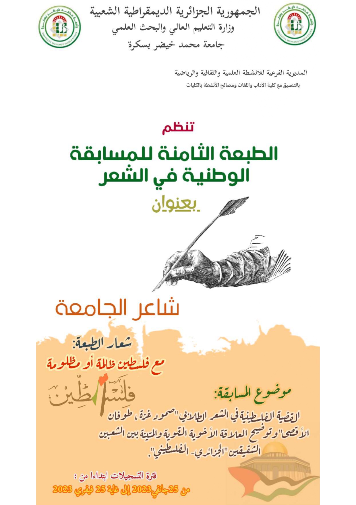 تنظم جامعة بسكرة الطبعة الثامنة من المسابقة الوطنية الجامعية للشعر عن بعد خلال الفترة الممتدة من 25 إلى غاية أفريل 2024 تحت شعار مع فلسطين ظالمة أو مظلومة.