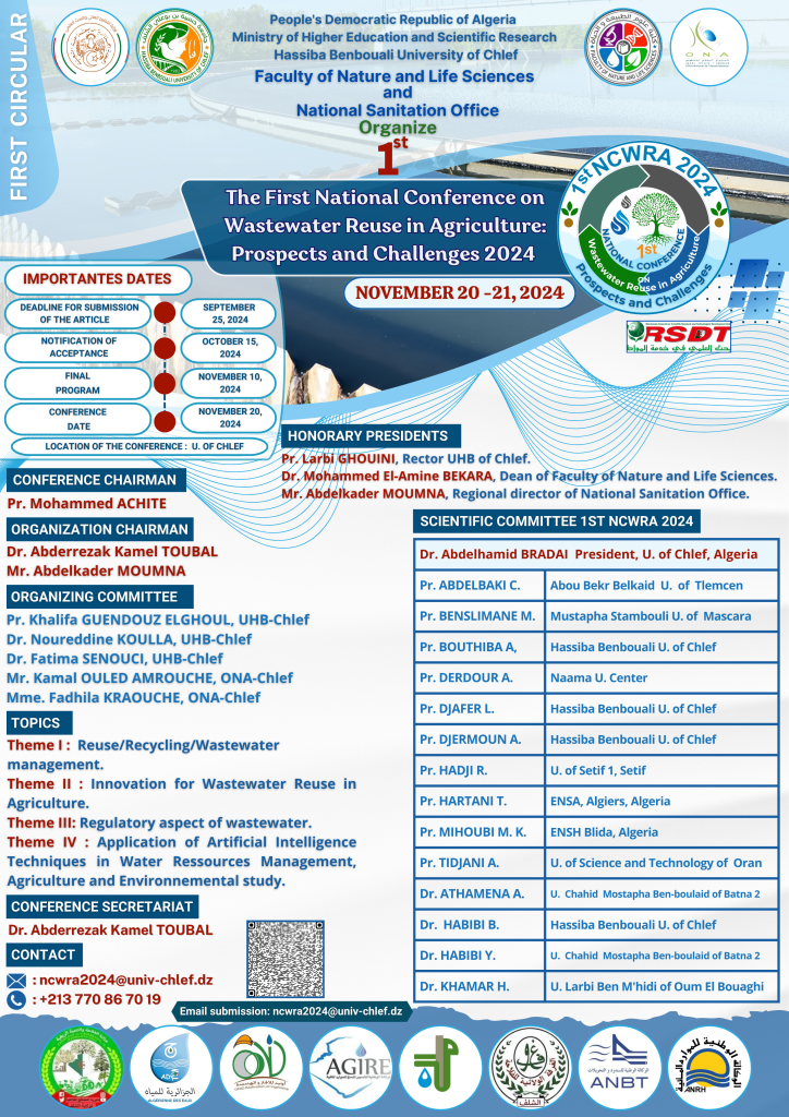 المؤتمر الأول لإعادة استخدام مياه الصرف الصحي في الزراعة: الآفاق والتحديات 2024بواسطة arabicadmin / 12 سبتمبر، 2024 [box type=”info” ] Fiche de Participation NCWRA2024 Template Word Extented Abstract NCWRA2024[/box]