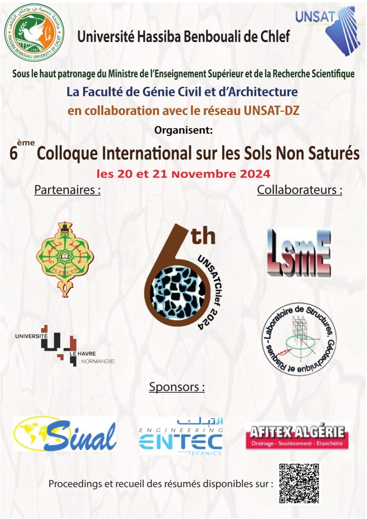 نظمت كلية الهندسة المدنية والمعمارية بالتعاون مع الشبكة UNSAT-DZ “الملتقى الدولي السادس حول التربة غير المشبعة ” يومي 20 و 21 نوفمبر 2024 .