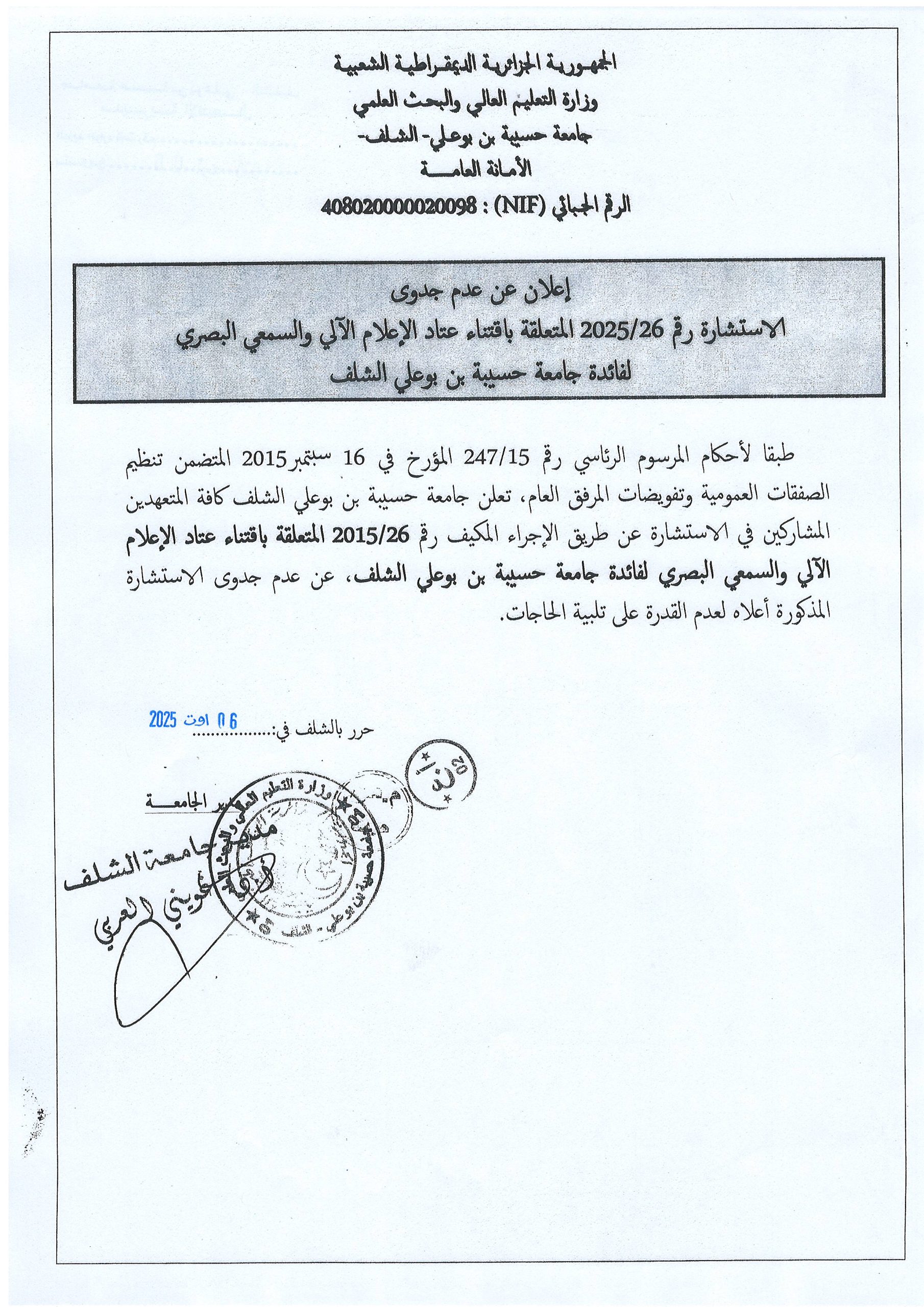 إعلان عن عدم جدوى الإستشارة 2025/26