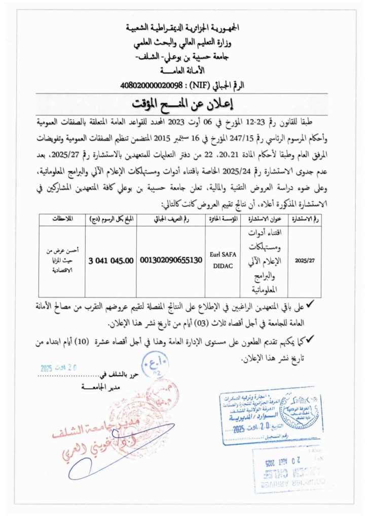 منح مؤقت للحصص رقم 01، 02، 03، 05 من الإستشارة رقم 2025/28