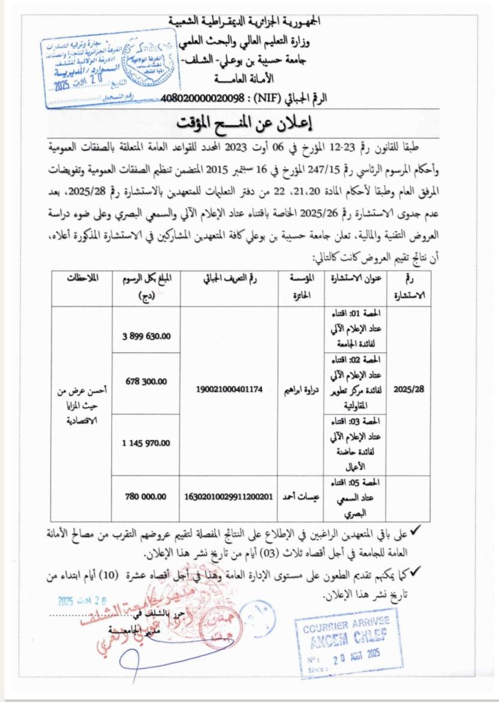 منح مؤقت للحصص رقم 01، 02، 03، 05 من الإستشارة رقم 2025/28