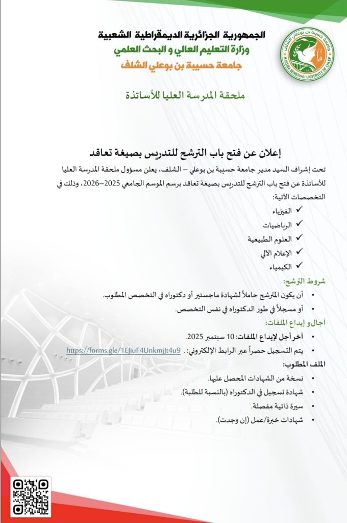 إعلان عن فتح باب الترشح للتدريس بصيغة التعاقدبواسطة arabicadmin / 3 سبتمبر، 2025 رابط الترشح: https://forms.gle/1EJiuF4UnkmjJt4u9