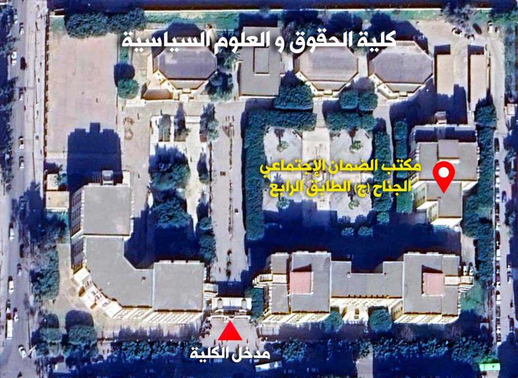 يرجى من الطلبة المعنيون بخدمة الإنتساب للضمان الإجتماعي من أجل الإستفادة من خدمات بطاقة الشفاء التقدم الى مكتب الضمان الإجتماعي الكائن بكلية الحقوق و العلوم السياسية، الجناح “ج” الطابق الرابع (وسط المدينة) قصد ايداع طلبات الانتساب سواءً انتساب جديد بالنسبة للطلبة الجدد أو تجديد الإنتساب بالنسبة للطلبة القدامى.
