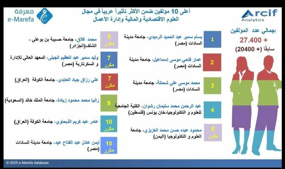 وفي السياق نفسه، يتقدّم الأستاذ البروفيسور العربي غويني، مدير الجامعة، بأسمى عبارات التقدير والاعتزاز إلى الأستاذ الدكتور محمد فلاق، بمناسبة اختياره ضمن قائمة العشرة الأوائل عربيًا واحتلاله المرتبة الخامسة في تصنيف معامل التأثير والاستشهادات المرجعية العربي (ARCIF) لسنة 2025، في مجال العلوم الاقتصادية والمالية وإدارة الأعمال، من بين أكثر من سبعةٍ وعشرين ألف باحث على المستوى العربي.