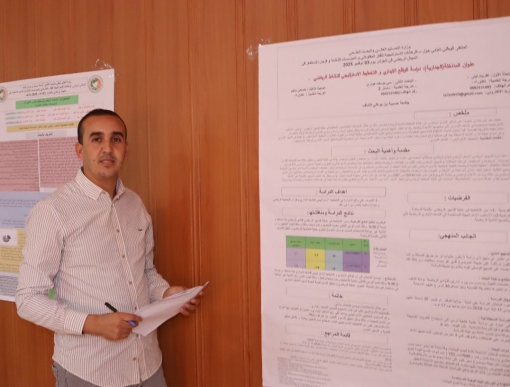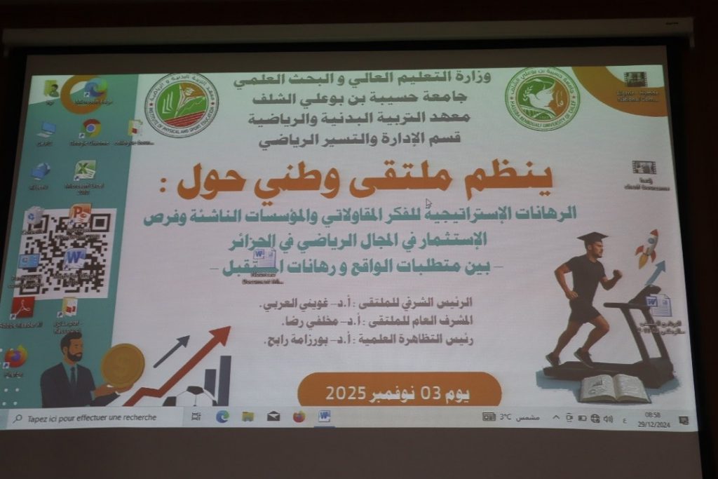 نظّم معهد التربية البدنية والرياضية – قسم الإدارة والتسيير الرياضي – يوم الاثنين 3 نوفمبر 2025، بقاعة المحاضرات بالقطب الجامعي أولاد فارس، ملتقى وطنيًا موسومًا بـ:”الرهانات الاستراتيجية للفكر المقاولاتي والمؤسسات الناشئة وفرص الاستثمار في المجال الرياضي في الجزائر بين متطلبات الواقع ورهانات المستقبل.”