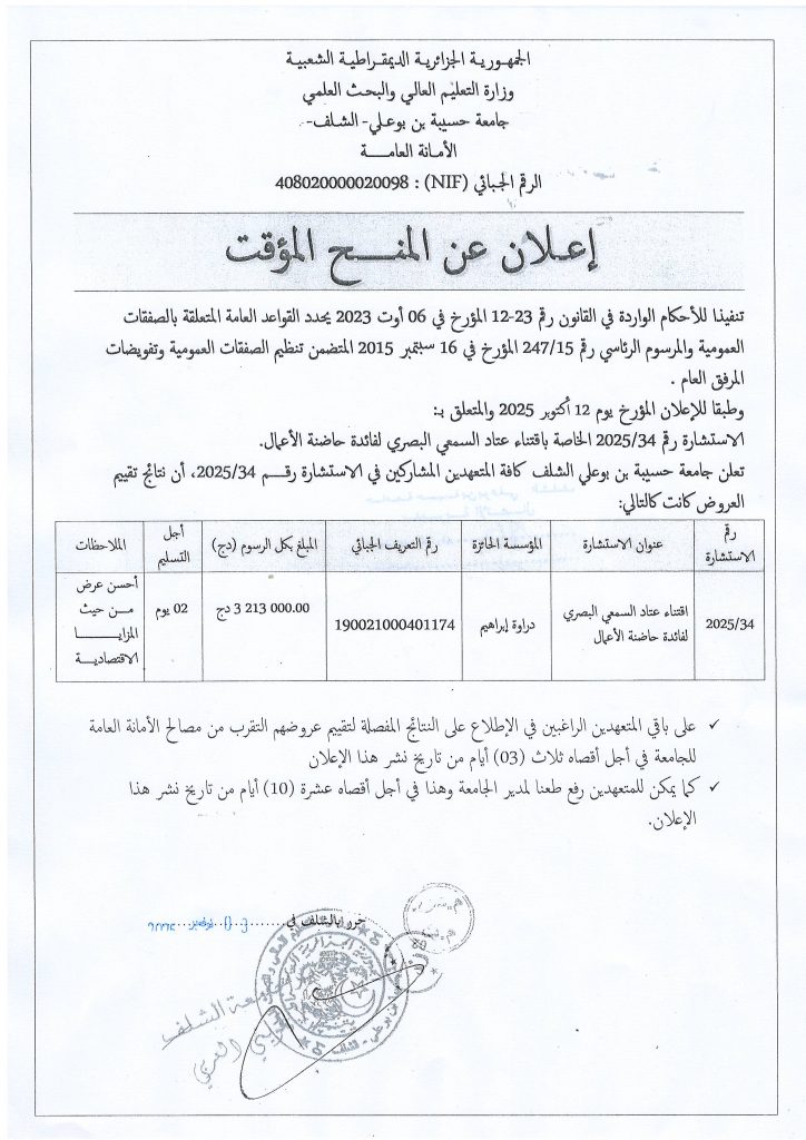إعلان عن المنح المؤقت للإستشارة 2025/34