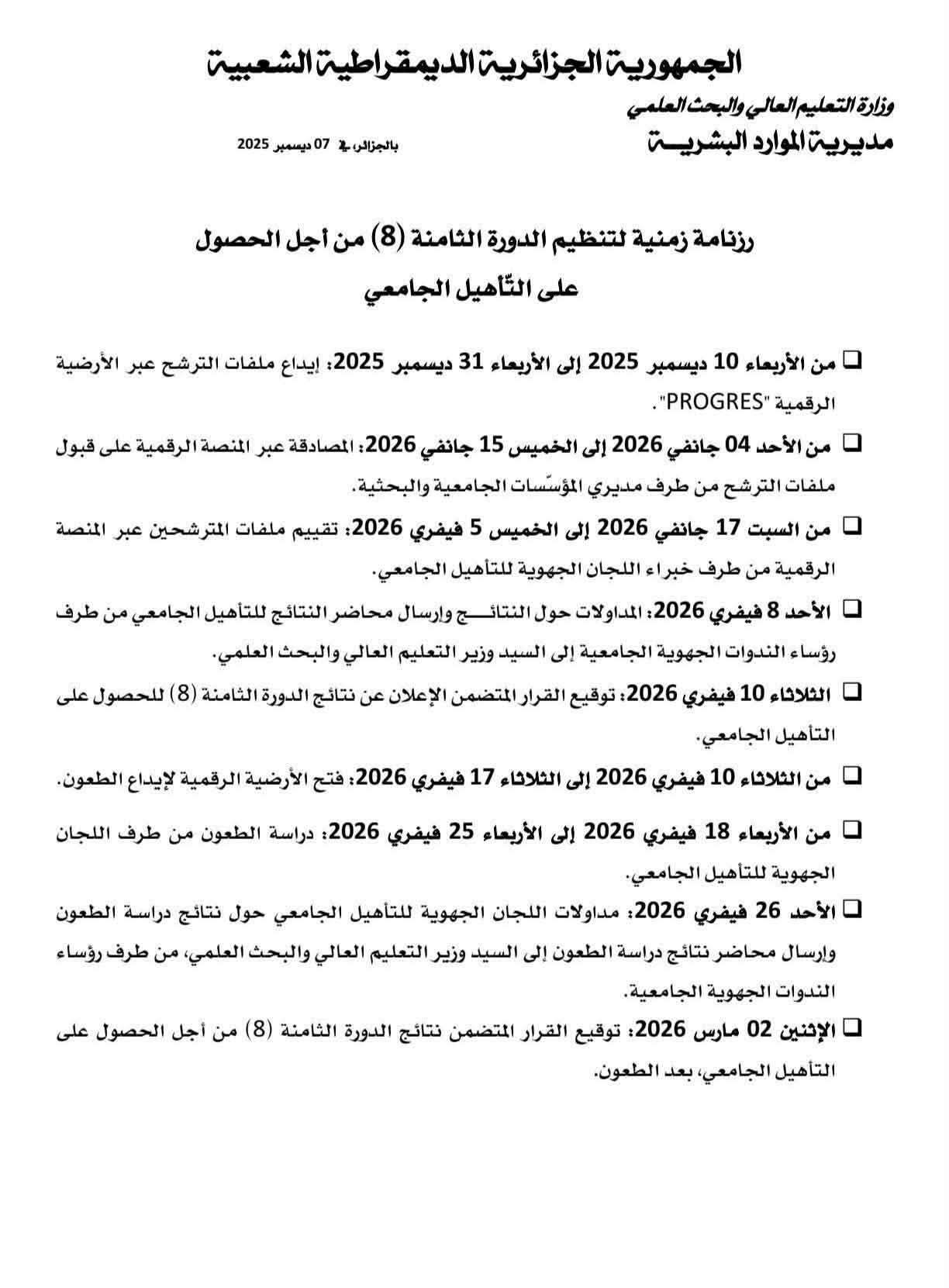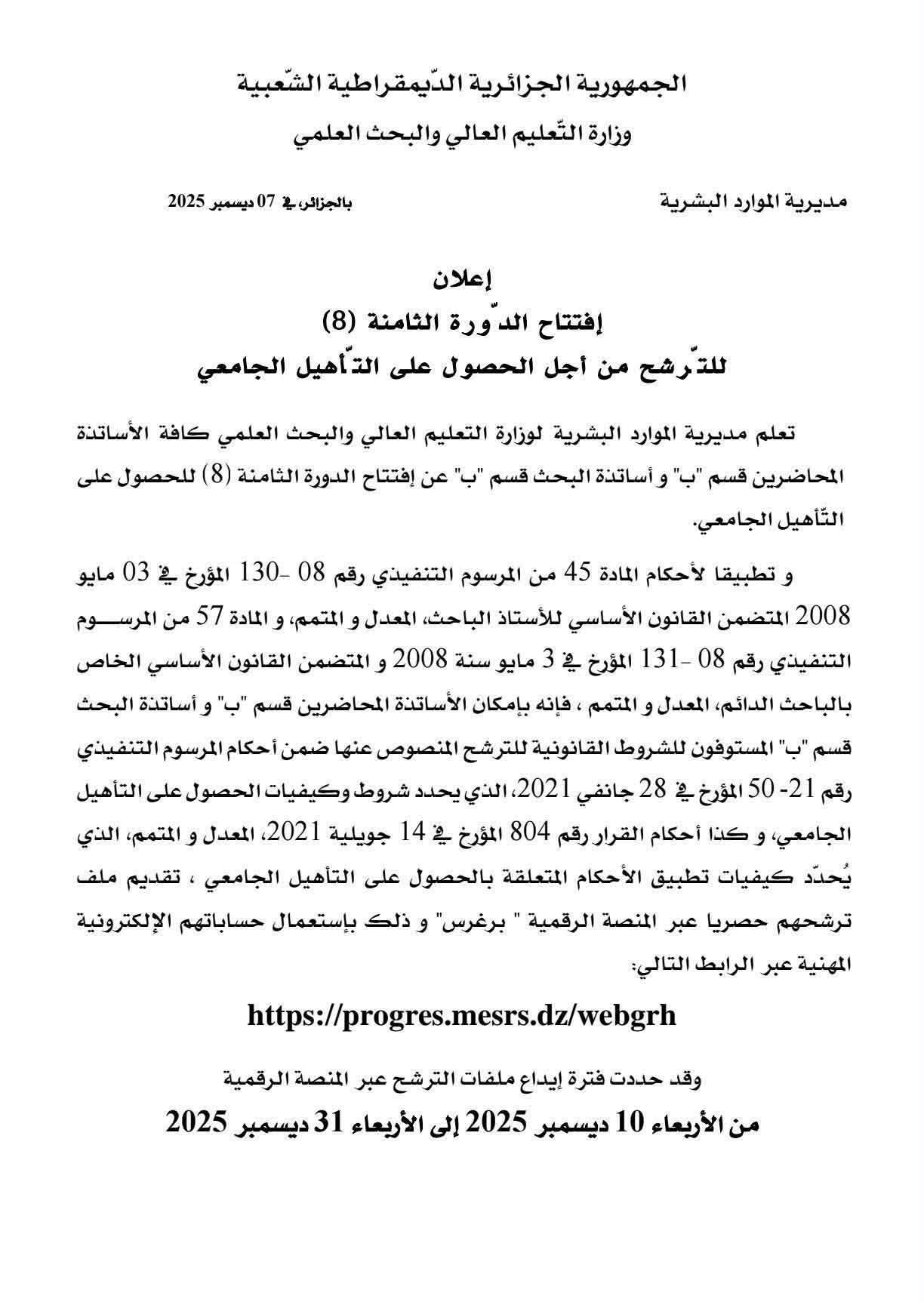 وتطبيقاً لأحكام المادة 45 من المرسوم التنفيذي رقم 08-130 المؤرخ في 03 ماي 2008 المتضمن القانون الأساسي للأستاذ الباحث، المعدَّل والمتمم، والمادة 57 من المرسوم التنفيذي رقم 08-131 المؤرخ في 03 ماي 2008 المتضمن القانون الأساسي الخاص بالباحث الدائم، المعدَّل والمتمم، فإنه يمكن للأساتذة المحاضرين قسم “ب” وأساتذة البحث قسم “ب” المستوفين للشروط القانونية للترشّح المنصوص عليها ضمن أحكام المرسوم التنفيذي رقم 21-50 المؤرخ في 28 جانفي 2021، الذي يحدد شروط وكيفيات الحصول على التأهيل الجامعي، وكذا أحكام القرار رقم 804 المؤرخ في 14 جويلية 2021 المعدِّل والمتمم، الذي يحدد كيفيات تمنح الأحكام المتعلقة بالحصول على التأهيل الجامعي، تقديم ملف ترشحهم حصرياً عبر المنصة الرقمية “بروغرس”، وذلك باستعمال حساباتهم الإلكترونية المهنية عبر الرابط التالي: