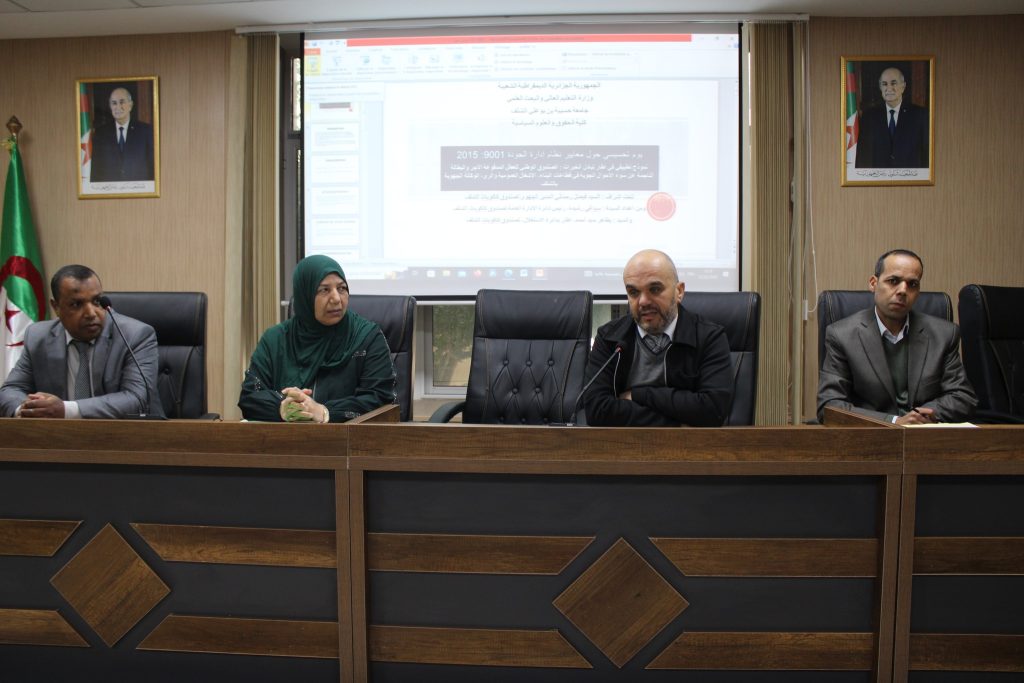 في إطار تعزيز ثقافة الجودة والارتقاء بالأداء المؤسسي، نظّمت كلية الحقوق والعلوم السياسية لجامعة الشلف، بتاريخ 22 فيفري 2026، وتحت إشراف عميد الكلية البروفيسور عماري إبراهيم، يوماً تحسيسياً لفائدة الأسرة الجامعية، وذلك بالشراكة مع الصندوق الوطني للعطل المدفوعة الأجر والبطالة الناجمة عن سوء الأحوال الجوية في قطاعات البناء والأشغال العمومية والري – الوكالة الجهوية بالشلف (كاكوبات).