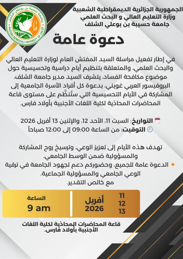في إطار تفعيل مراسلة السيد المفتش العام لوزارة التعليم العالي والبحث العلمي، والمتعلقة بتنظيم أيام دراسية وتحسيسية حول موضوع مكافحة الفساد، يتشرف السيد مدير جامعة الشلف، البروفيسور العربي غويني، بدعوة كل أفراد الأسرة الجامعية إلى المشاركة في الأيام التحسيسية التي ستُنظّم على مستوى قاعة المحاضرات المحاذية لكلية اللغات الأجنبية بأولاد فارس.